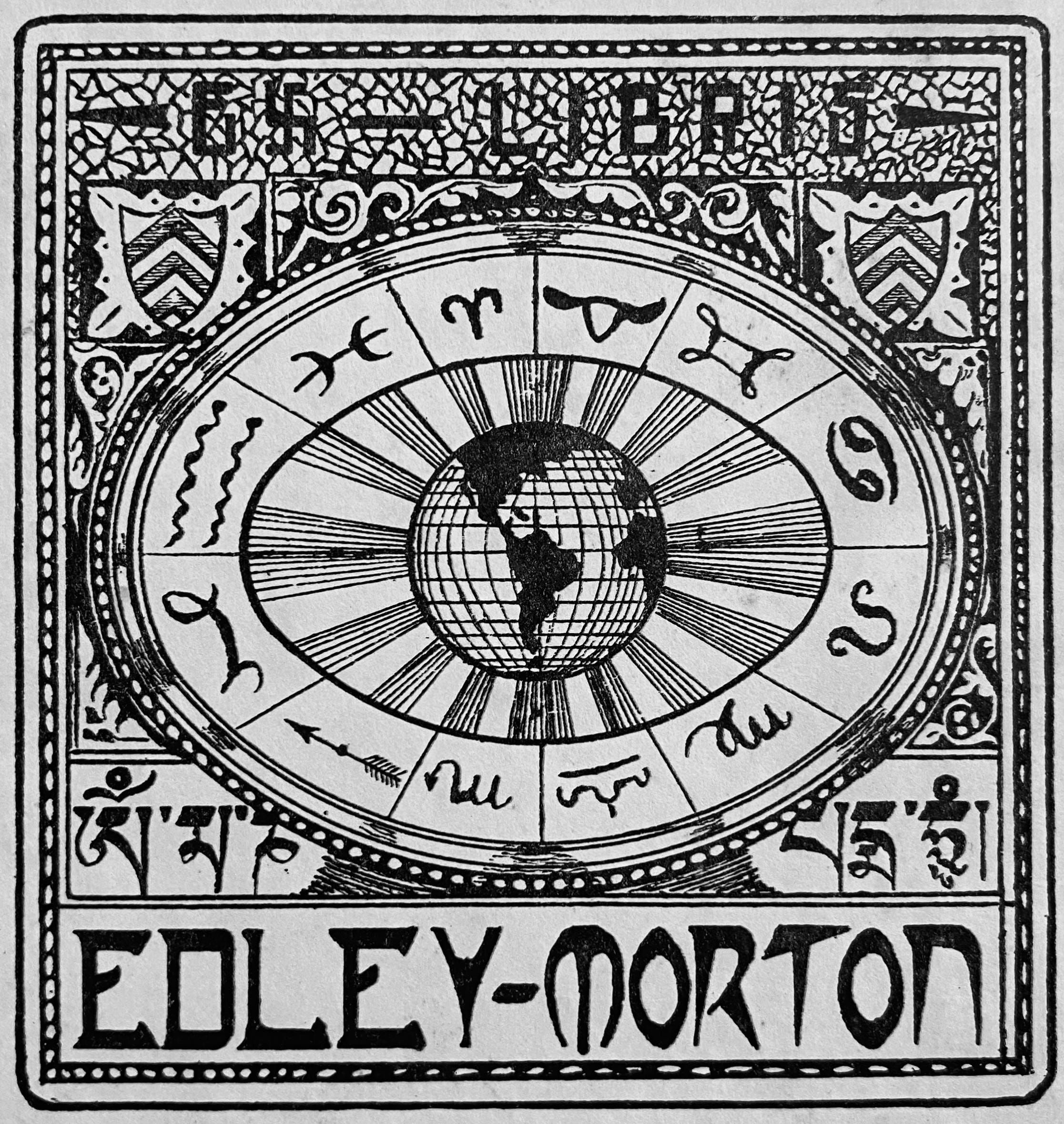 At the centre of the bookplate is a globe of the world, radiating light, around which are arranged the signs of the zodiac. Beneath the central cartouche are strange, oriental-seeming letters (I thought initially these might be Sanskrit, but they seem to be Tibetan; if anyone can offer further clarity on them, I’d be grateful), and above it are coats of arms bearing simple chevrons. At the top of the bookplate, the ‘X’ of EX LIBRIS takes the form of a swastika – a symbol widely popular before its perversion by the Nazis – while the name ‘Edley-Morton’ appears in a striking and rather out-of-place script at the bottom of the plate, since the letters are redolent of the psychedelic designs of the 1960s rather than the 1920s. Yet, if ‘Edley-Morton’ was the book’s first owner (as seemed likely), then he presumably acquired it shortly after its publication in the 1920s.