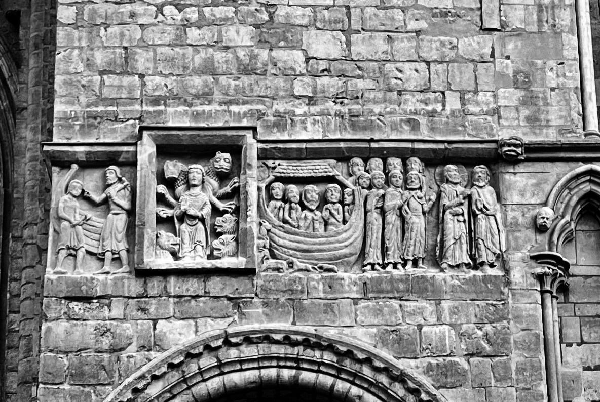 One of the extraordinary Romanesque reliefs on the west front of Lincoln Cathedral depicts the story of Noah’s Ark, rudely interrupted by a slightly later relief set within a square frame that cuts between the building of the Ark and its launch. In the square frame is ostensibly a depiction of Daniel in the lion’s den; a seated, serene and robed figure …